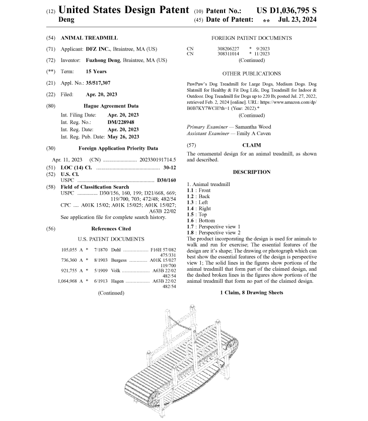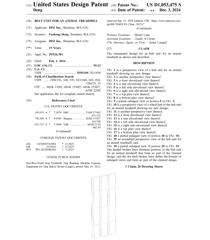 涉案外观专利仍处于密封状态,经查询发现原告名下BELT UNIT FOR AN ANIMAL TREADMILL宠物跑步机皮带单元(USD1053475S)及ANIMAL TREADMILL宠物跑步机(USD1036795S)两件美国外观专利,有卖同款产品的需小心: