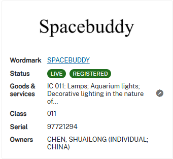 SPACEBUDDY商标注册在11类灯具、水族灯、节日装饰用彩灯、LED 灯等,商标号7269219: