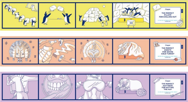 在广告营销上,Casper也做了颠覆的思考。以往的床垫等舒适类用品广告都是用大字标题,告诉用户床垫的舒适,Casper从用户角度出发,邀请艺术家画了一系列插画,用不同的动物代表不同的人群,从而传达给用户不同的人睡在我们的床垫上会体验不一样的舒适。