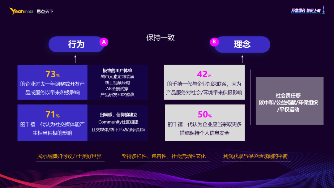 42%的千禧一代认为与企业加深联系是因为产品的服务对社会可以带来积极的影响,反馈到行为,已经有73%的企业在过去一年调整产品和服务,以便带来更积极的影响。