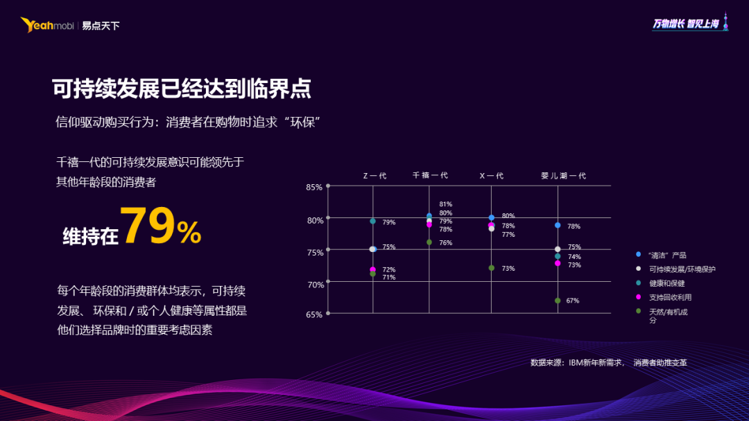这里要着重强调一下,疫情后,可持续发展已经达到了一个临界点,消费者在购物的时候越来越追求环保,千禧一代对于可持续发展的意识远远领先于其他年龄的消费者。