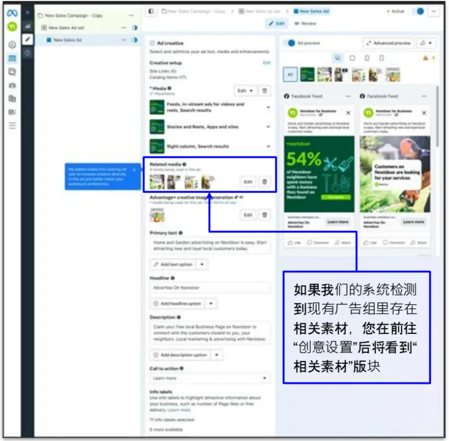 2、如果Meta官方的系统检测到现有广告组里存在相关素材,广告主在前往“创意设置”后将看到“相关素材”版块,其中包含建议添加到新建广告组中的创意。