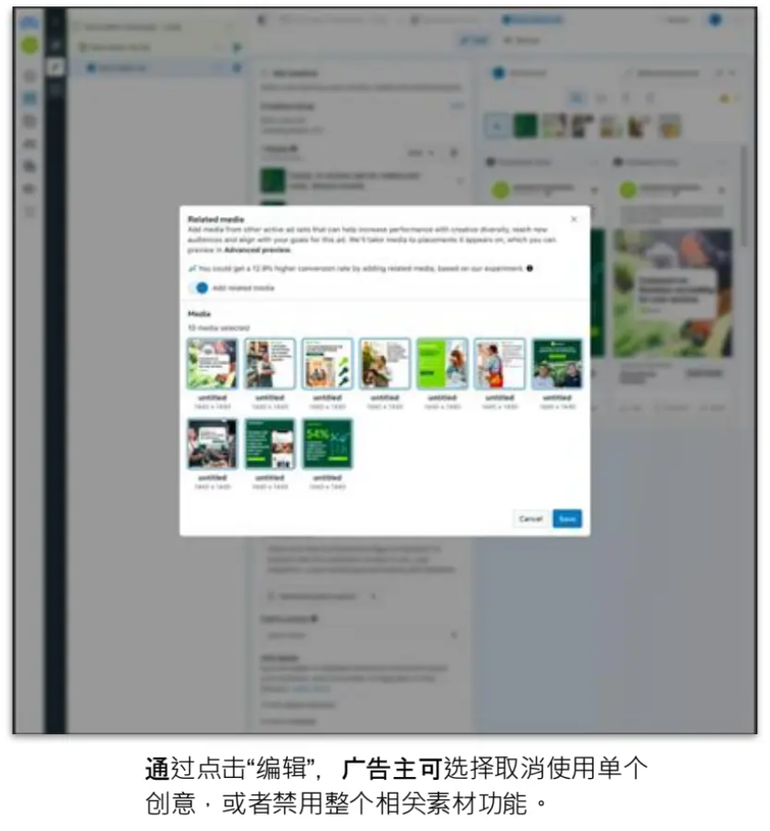 若要取消使用单个导入的广告,在创建新广告或编辑现有广告时,前往广告层级 >“创意设置”>“相关素材”> 点击“编辑”,并取消选择您不想添加的素材。