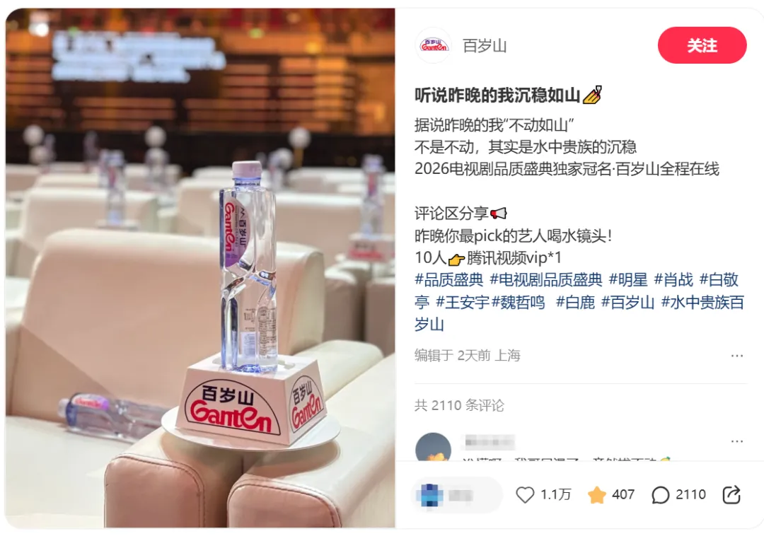 事情是这样的,几天前的2026电视剧品质盛典上,作为独家冠名商的百岁山在每一个嘉宾席座位的中间摆上了一瓶自家产品,按理说,作为一场活动中的独家冠名,百岁山这样的产品摆放位置和曝光程度是十分合理的,可让品牌方和在座嘉宾都没想到的是,一场乌龙就此拉开序幕。