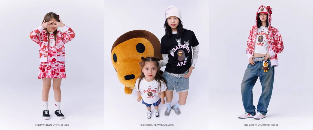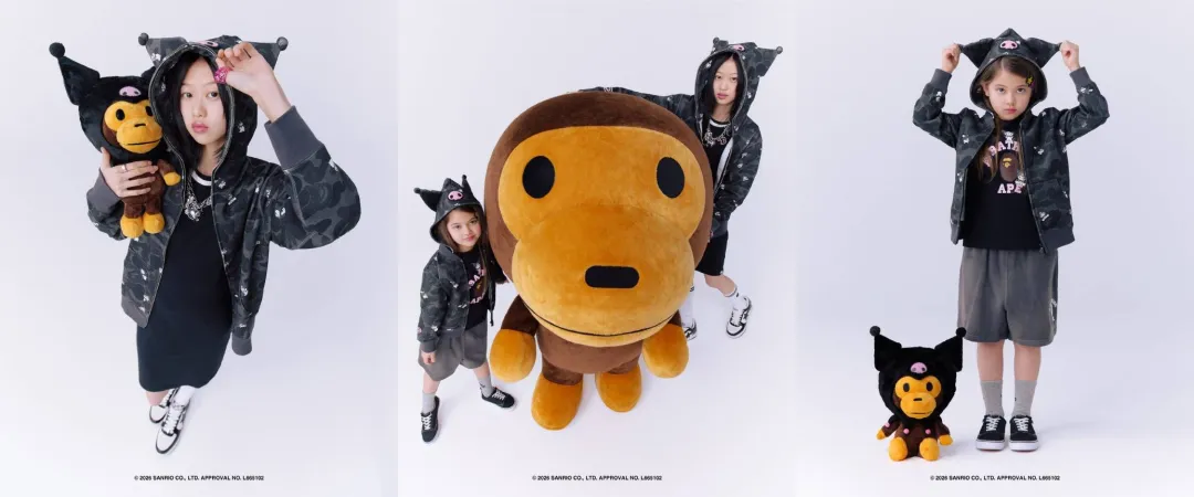 系列专属原创印花暗藏巧思,将两位三丽鸥明星的身影隐匿于BAPE经典的猿人头与迷彩元素之中,带来充满想象力的视觉探索乐趣,标志性的APE HEAD被创意性地戴上了HELLO KITTY与KUROMI的角色头套,萌趣十足又不失街头态度。