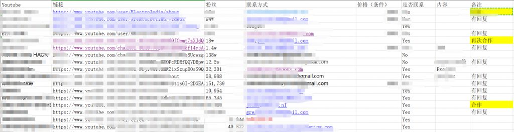 寻找到KOL后,我会做一个KOL资源表(一定要做),便于分析该KOL粉丝增长情况/是否联系/价格/效果等