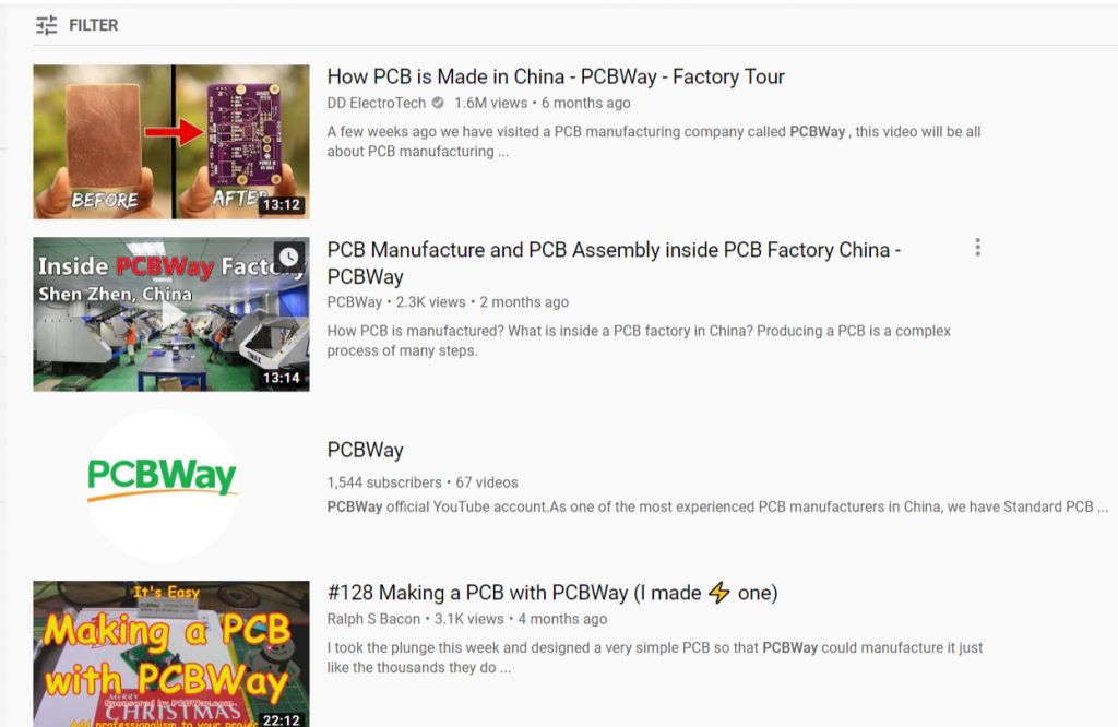 搜索PCBway你可以看到很多KOL发布的视频,他自己发布的视频聊聊无几,而且关注度也不高。KOL发布的视频将PCBway的优势展现的淋漓尽致。