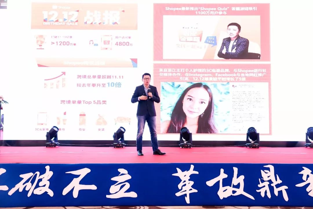 再把目光看到跨境的业务,2018年我们跨境业务最重要的关键词叫“跑赢大盘”,我举一个例子,这也是我们最亮眼的成绩,我们跨境比去年增长了6倍,在11.11增加了8倍,到12.12增长了10倍,由此可见我们跨境对Shopee业绩不断增长。我们看双12的战绩,我们销售了1200万单,我们跨境增长了10倍,我们TOP5个品类,3C家电、母婴、女装、化妆品和家具,我们把很多的玩法引入大了东南亚,我们在台湾,很多地区推出了抢答券的活动,我们也和当地的网红进行配合,这个网红在东南亚非常火的网红,帮助我们一个浙江的3C品牌做了一个很好的推广,也帮助这个品牌得到非常好的成绩。