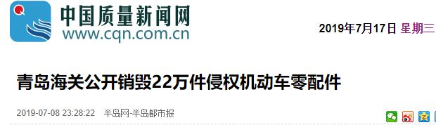 青岛海关方面,7月4日,青岛海关隶属黄岛海关公开无害化销毁22万件侵权机动车零配件,包括柴油机、水泵、空气滤清器、曲轴等40余种产品,侵犯了潍柴、MINH、TOYOTA等国内外品牌商标专用权。这是近年来青岛海关针对侵权机动车零配件类货物实施的最大规模集中销毁行动。