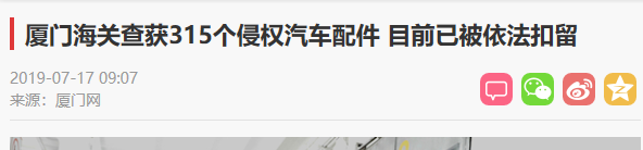 厦门海关方面,7月16日,“MITSUBISHI”商标权利人三菱重工业株式会社致函厦门海关,确认日前由厦门海关隶属东渡海关查获的共计315个带有其品牌字样及图形的汽车配件为侵权商品,并申请海关实施知识产权保护。