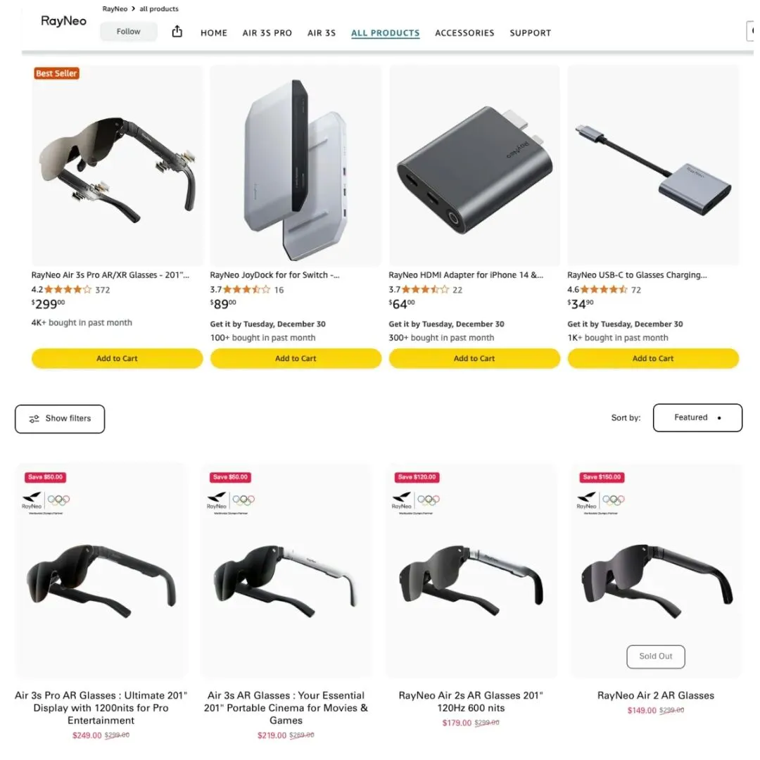 RayNeo在不同平台采取了差异化的产品策略 ——亚马逊以标准型号为主,而品牌独立站则提供更多定制化选项和高端型号。