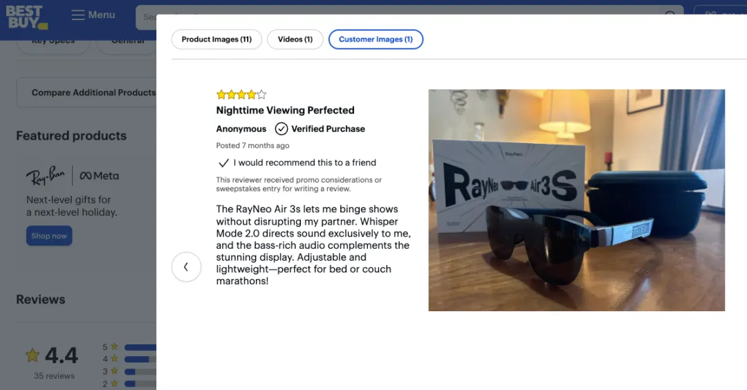 在亚马逊平台,RayNeo长期占据“视频显示眼镜”品类销量前三,用户评分维持在4.2星以上。平台渠道的优势在于能够快速触达对平台有信任感的消费者,特别是在新市场进入初期。