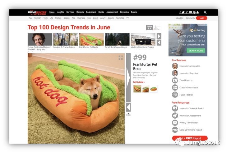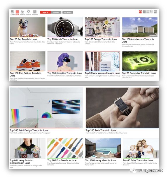 这个网站有一点特别好,它可以给读者提供某一个品类在上一个月的创意,下图中可以看到的第一个标题叫“Top 25 Pet Trends in June”,点进去大家就可以看到在宠物品类中比较流行的一些产品创意。