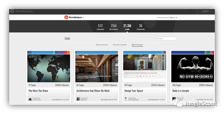 TrendHunter还有另外一个优点,它是一个免费的信息平台,大家还可以免费订阅流行趋势的报告。和它类似的一个平台叫做www.StumbleUpon.com。在这个平台上可以点击“Most Popular”或者选择热门或者感兴趣的品类/话题,来查找相关的子话题。最近这个网站好像被另一家公司收购了,所以界面会不同。