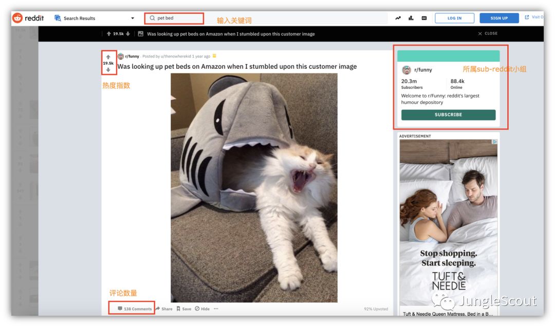 还用上面提到的宠物床(pet bed)举例,在Reddit上输入这个关键词后就可以看到很多和宠物床相关的搜索结果,其中一个鲨鱼款式的宠物猫床获得了19.5k (接近2万)个支持和138条留言,反映了大家对它的喜爱。