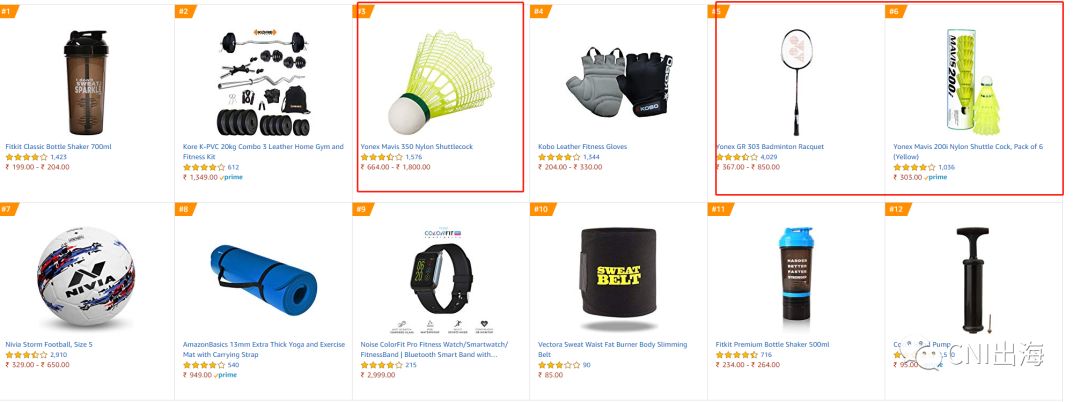 尽管Saina Nehwal要比前两位的人气差不少,但并不影响羽毛球在印度仍是非常受欢迎的运动。亚马逊印度运动、健身和户外这一分类中,羽毛球相关用品(羽毛球和球拍)卖得最好,热销前100名里有9项是羽毛球相关,然后是护具、运动腕表、水杯以及其他运动器材。