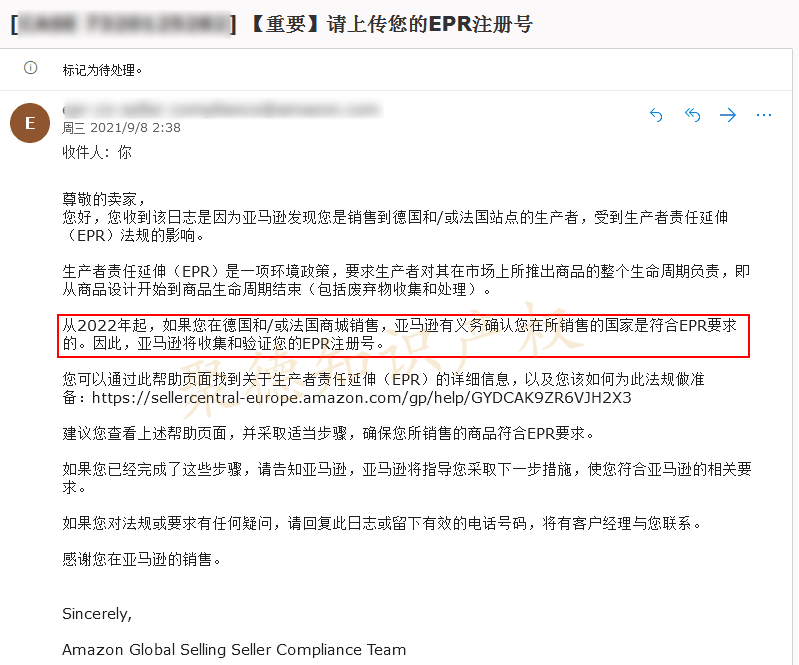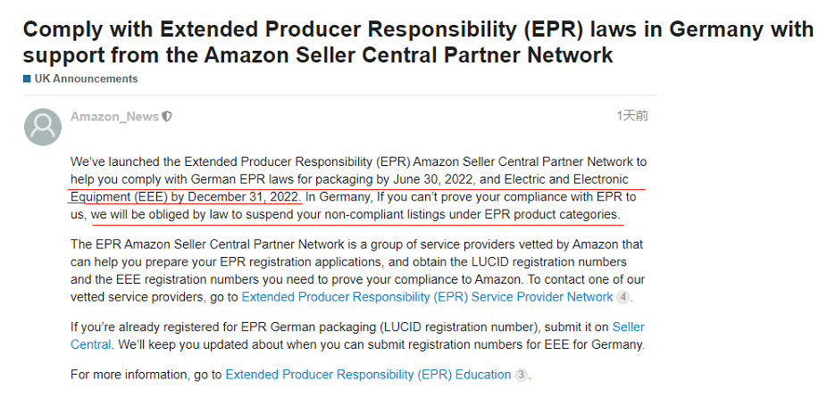 早在2021年,亚马逊不但发布公告告知德国卖家需在2022年上传EPR注册号,还以平台邮件方式发送给卖家。