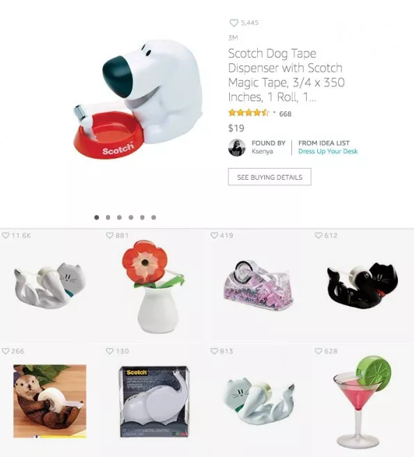 当消费者进一步点选对某个商品感兴趣时,他可以看到这个产品在Amazon上的评价、售价、有多少人收藏、是哪一个人的收藏清单,而下方还会再推其他类似且消费者可能感兴趣的产品,并显示有多少人将那些商品收藏。