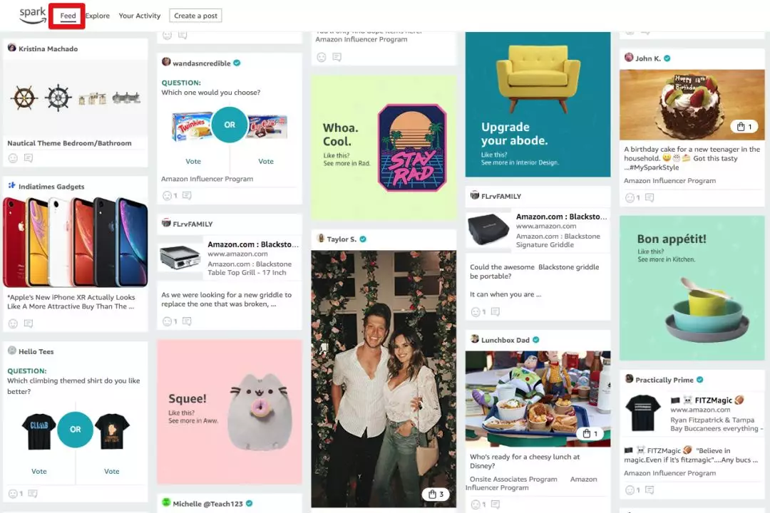 随着Instagram、Pinterest的图像收藏功能,再加上网红经济的崛起,Amazon 推出了Spark Feed,希望能让消费者更喜欢在Amazon浏览商品,发现自己喜欢的东西,以及其他和他有相同兴趣偏好的亚马逊付费会员,打造一个由Amazon Prime会员主动讨论、分享的社群,此外消费者也能看到自己喜欢的大V所推荐、使用的商品,延长Amazon Prime会员停留在网站的时间及购物金额。