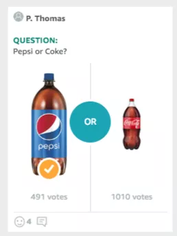 而你可能会好奇,为什么百事可乐在整个动态墙上的图示比较大呢?在下方投票结果中也表明,投票者比较喜欢可口可乐。