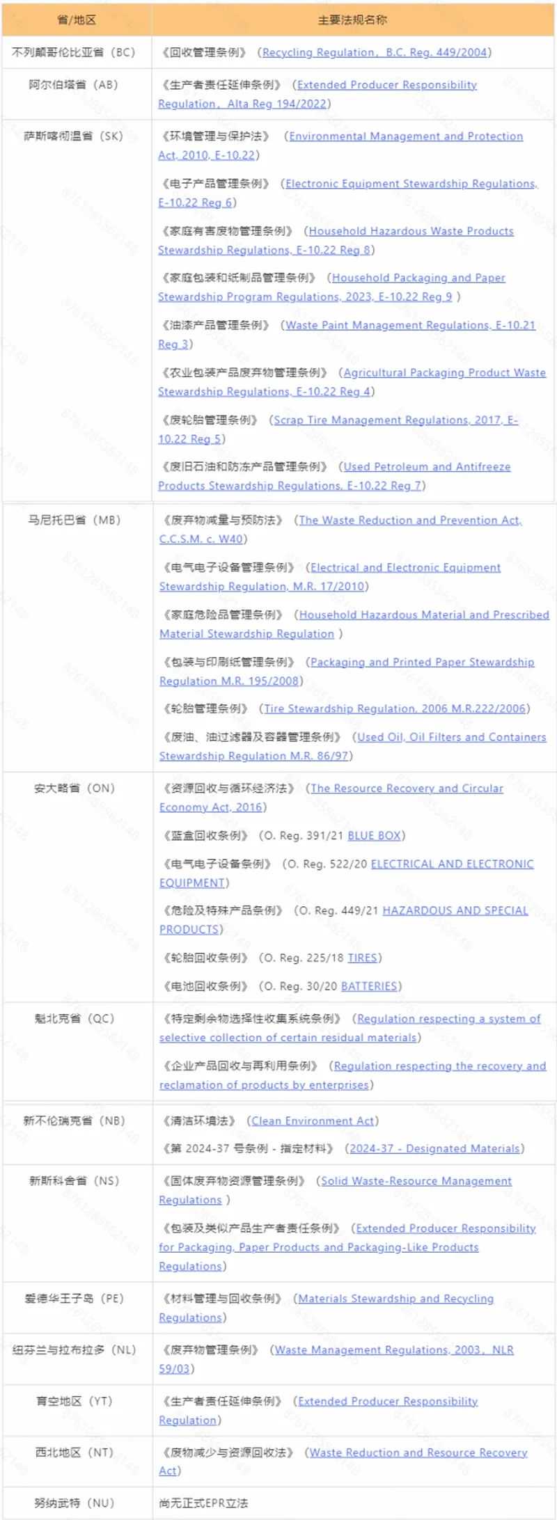 加拿大各省及地区EPR相关法规参考: