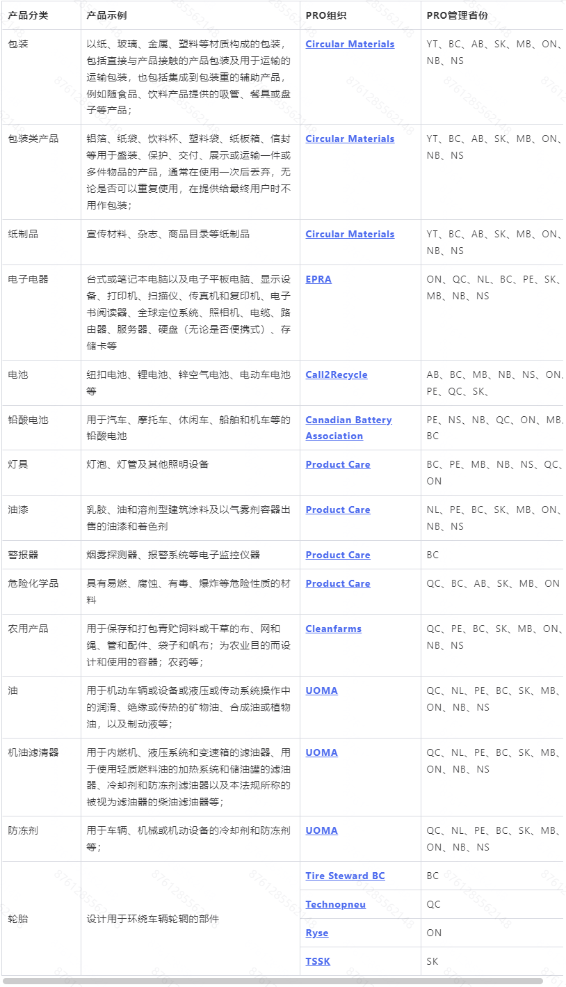 加拿大地区主要的生产者责任组织有: