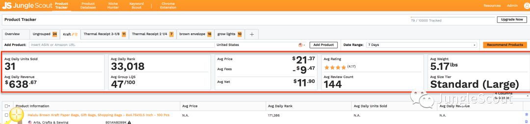登录WebApp在产品跟踪器页面下,当各位卖家选择了其中一组产品,下图选择的是“Kraft”,软件会显示以下列表,包含了该分组跟踪的产品的各个指标的平均值:日销量、日收入、日排名、日LQS等等,都是就这一个组别内所跟踪的产品而言。