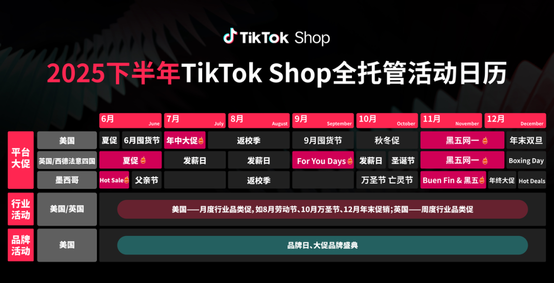 下半年,TikTok Shop将推出夏季大促、年中大促、黑五、网络星期一等大促活动,覆盖美国、英国、欧洲、墨西哥等市场,是商家获取新增量、提升品牌知名度的绝佳机会。