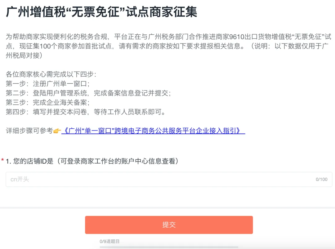 表格提到,为帮助商家实现便利化的税务合规,平台正在与广州税务部门合作推进商家9610出口货物增值税“无票免征”试点,现征集100个商家参加首批试点,请有需求的商家按如下要求提报相关信息。(说明:以下数据仅用于广州税局对接)。