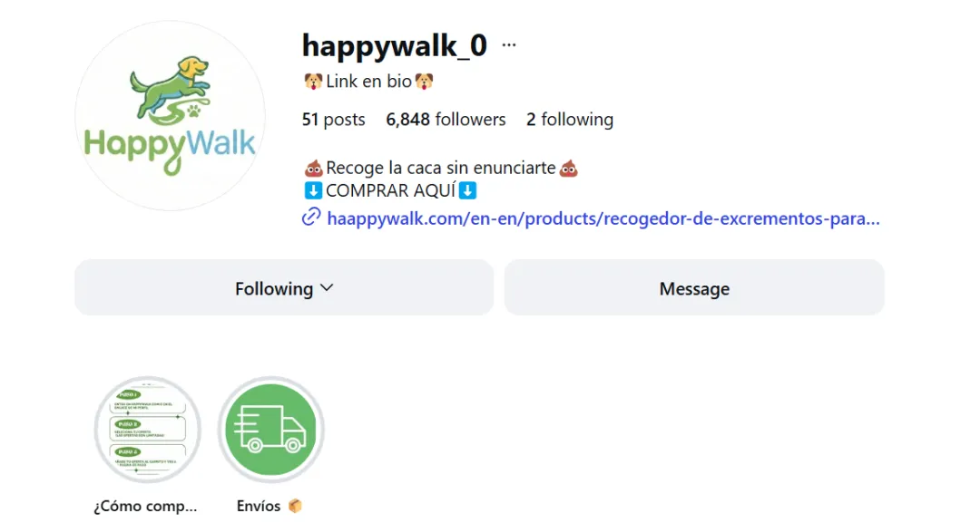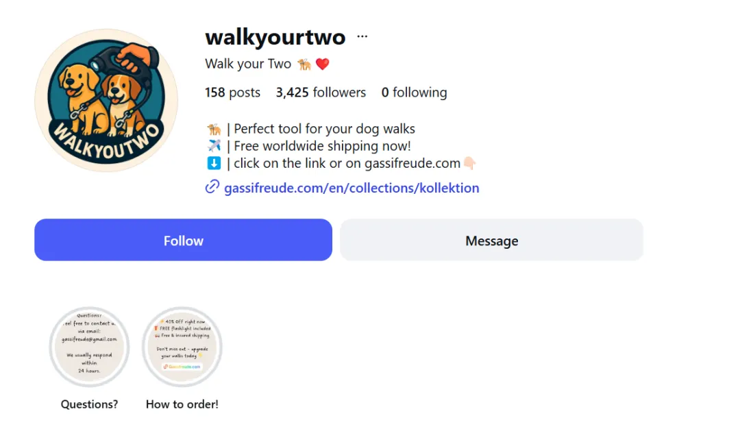 这个ins账户目前发帖158个,粉丝数量3425个,主推的就是一款户外牵狗绳子,卖点就是可以同时牵住两条狗,这对于一些养了两条狗的用户来说,绝对是方便了很多。