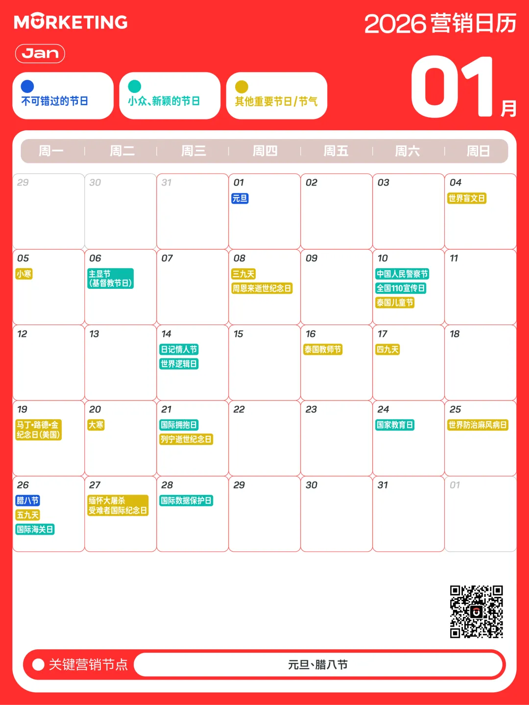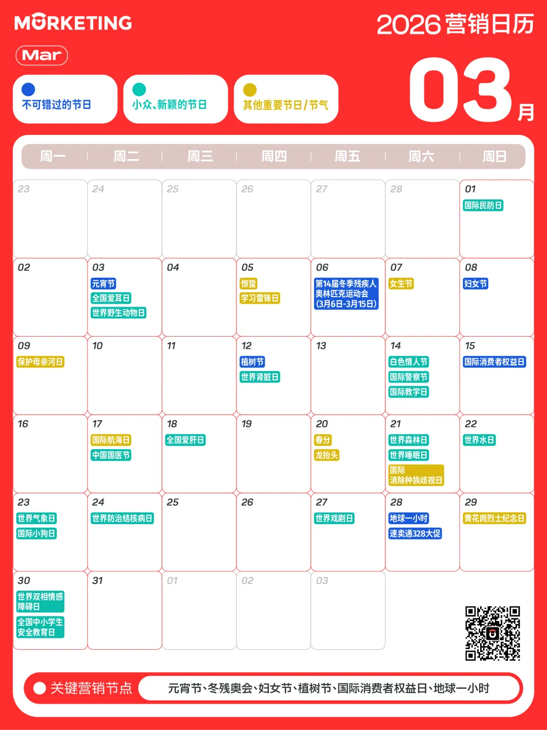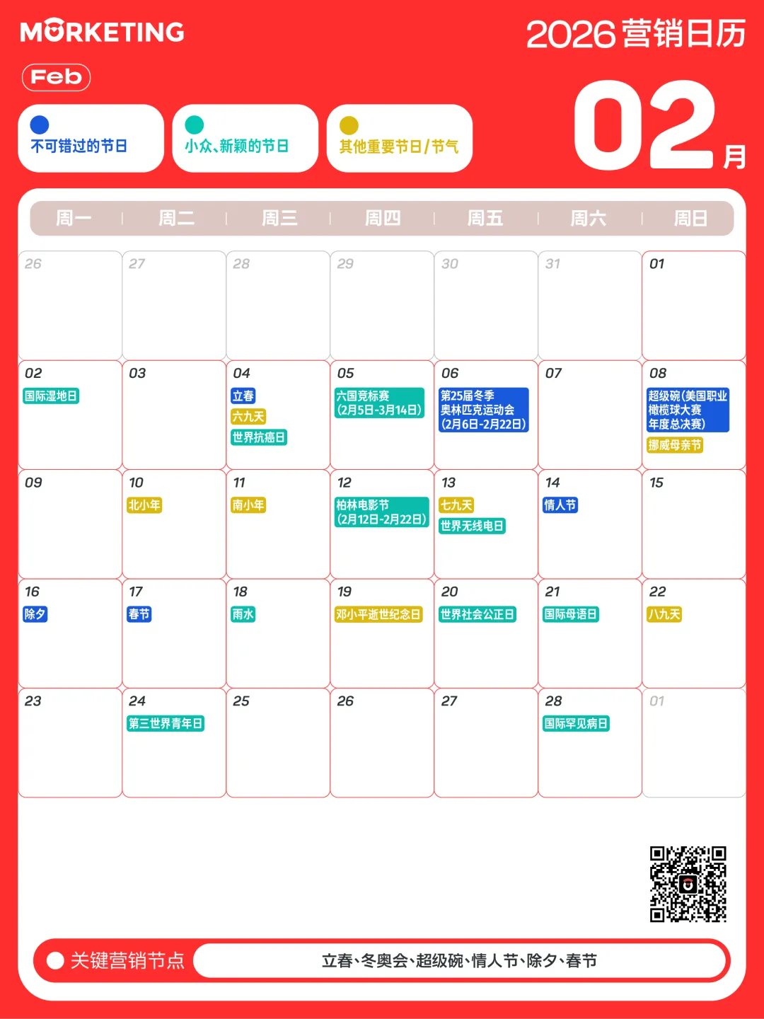 对此,Morketing梳理了「2026年营销日历」,涵盖了传统节日、小众节日及电商热点等近300个值得关注的营销节点,同时给出说明和提示,帮助大家抓住营销关键时刻。