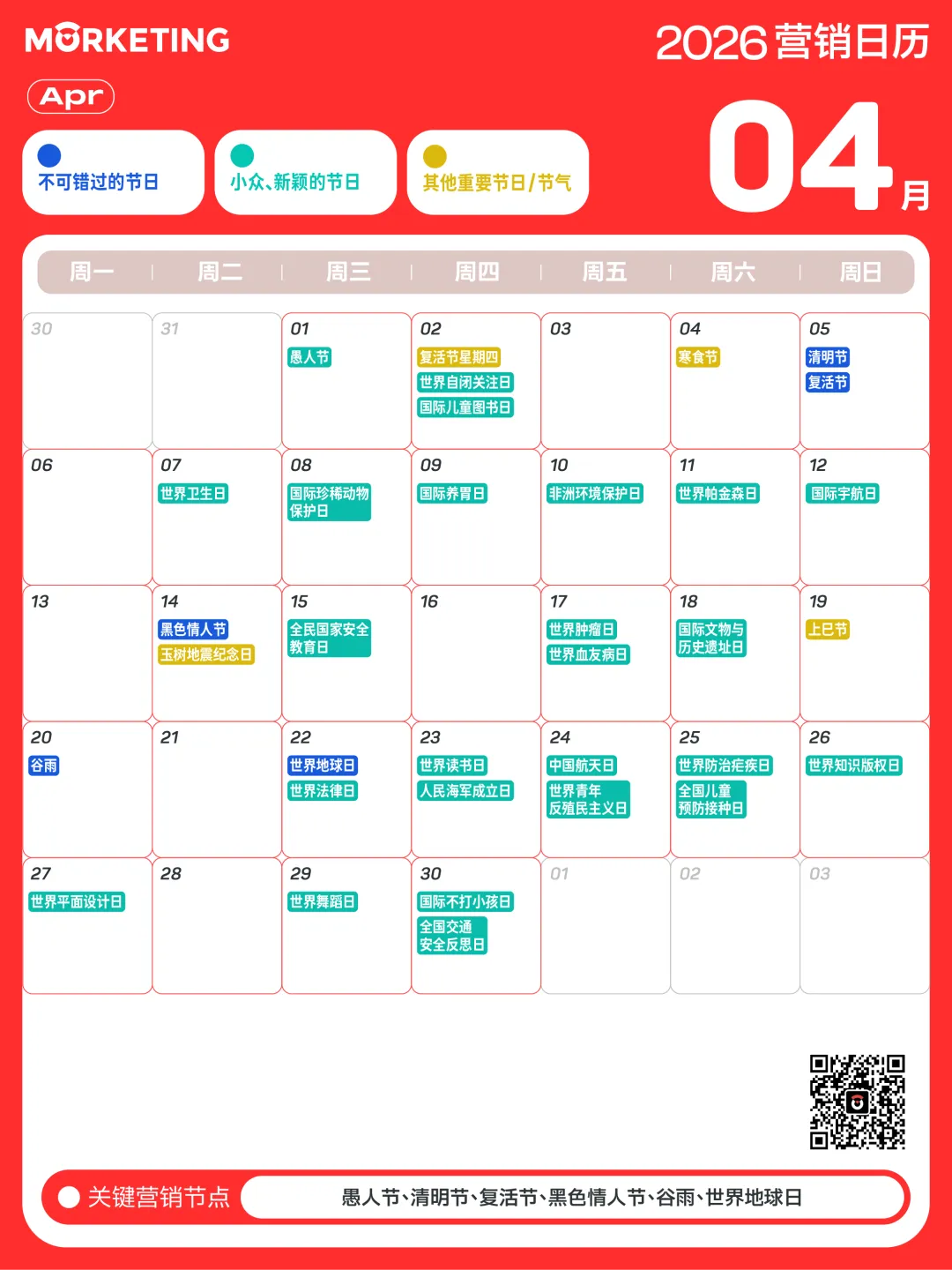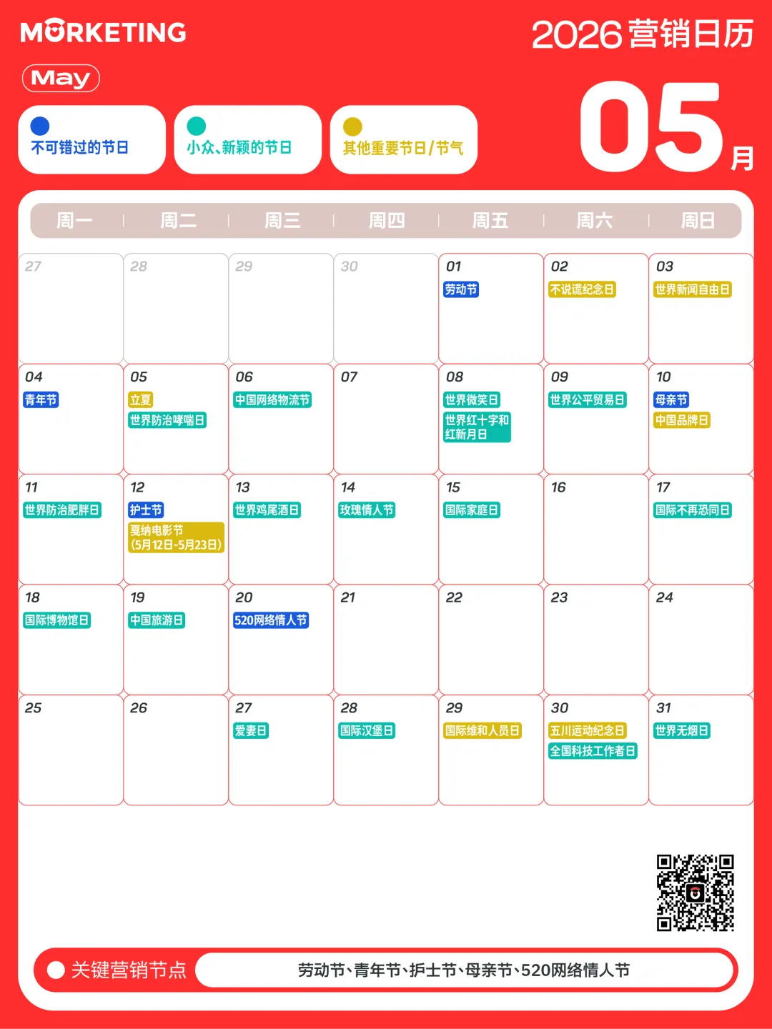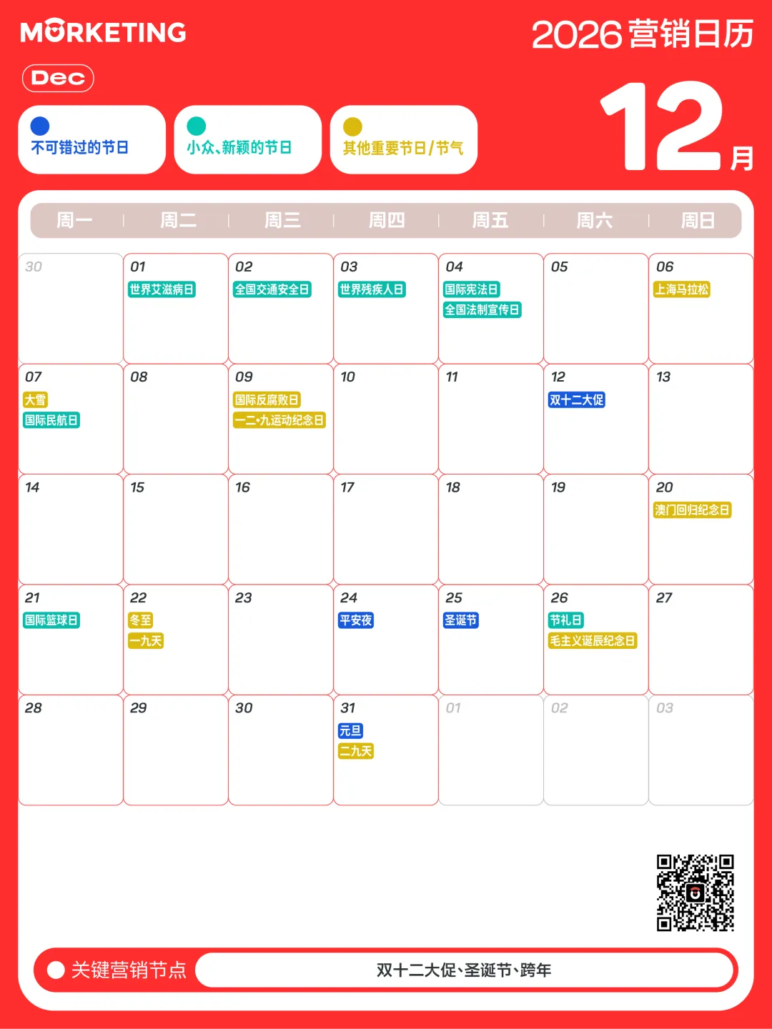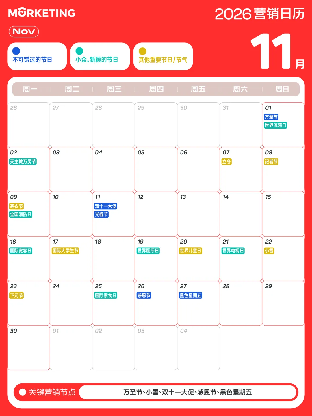 对此,Morketing梳理了「2026年营销日历」,涵盖了传统节日、小众节日及电商热点等近300个值得关注的营销节点,同时给出说明和提示,帮助大家抓住营销关键时刻。