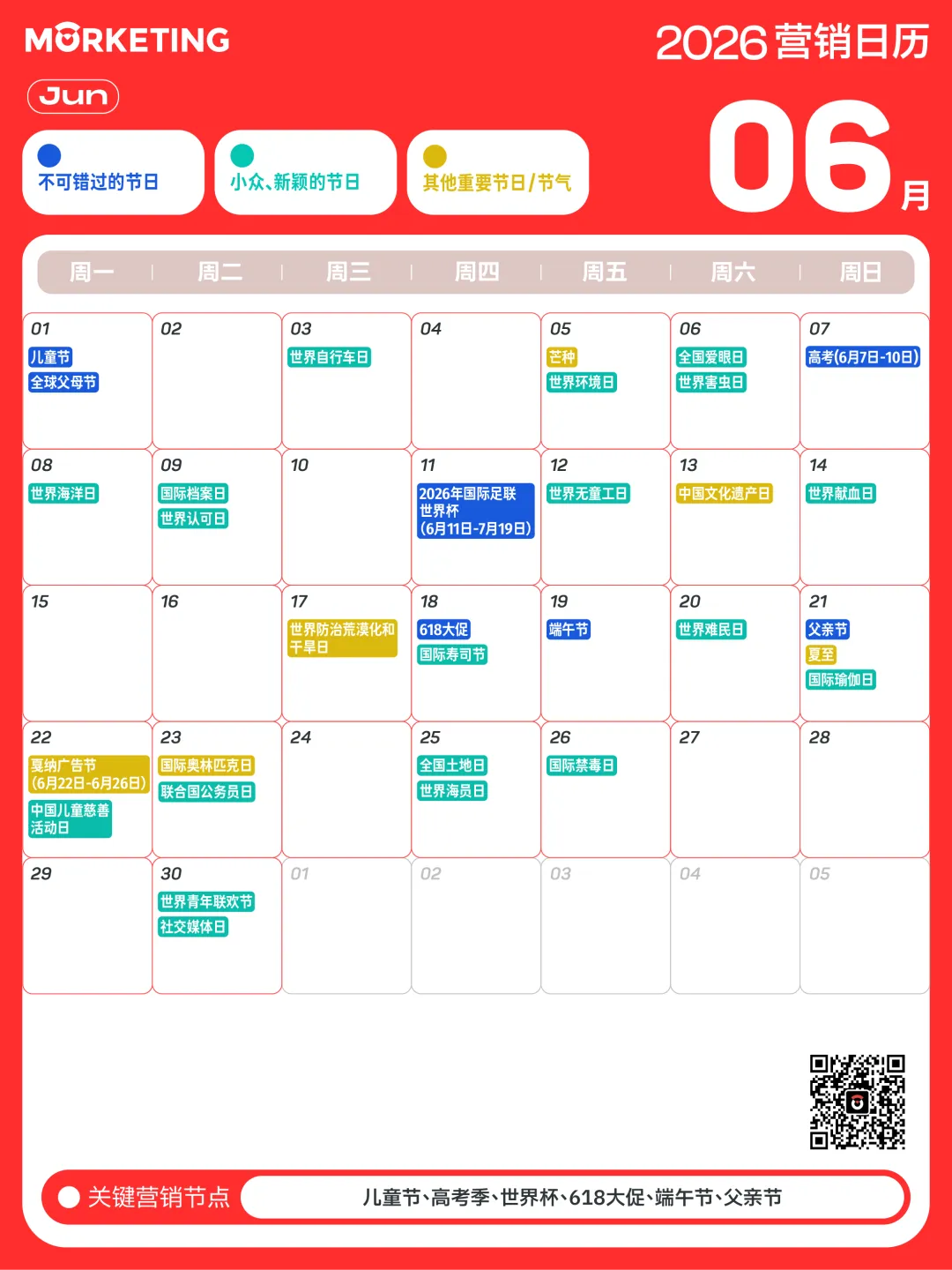 6月的营销节点密集而多维,这个月不仅有儿童节的趣味亲子、高考季的陪伴关怀,还有世界杯的全民参与、618的购物热潮,以及端午节和父亲节带来的情感与文化场景。