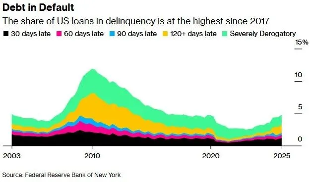信用卡违约率持续攀升,且集中反映低收入家庭压力,这与历史模式类似,是消费动能减弱的明确预警。