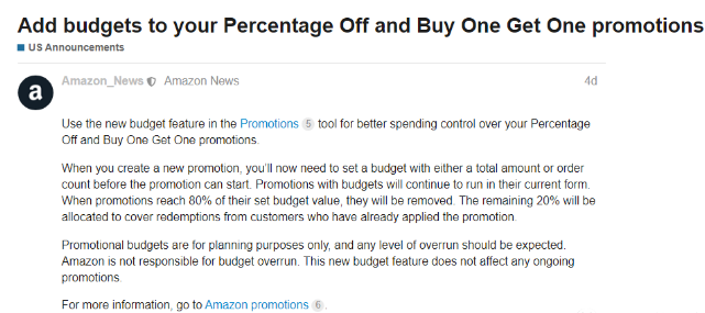 以后设置“折扣百分比”和“买一赠一”活动,需要设置活动预算。当促销达到其设定预算值的80%时,促销活动将被下线,剩余的 20% 预算将用于支付已参与促销活动的买家兑换产生的费用。