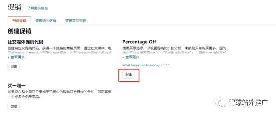 然后创建Percentage Off的折扣码,此折扣码最高支持50%OFF的折扣,如需超过50%OFF,请选择创建社交媒体折扣。