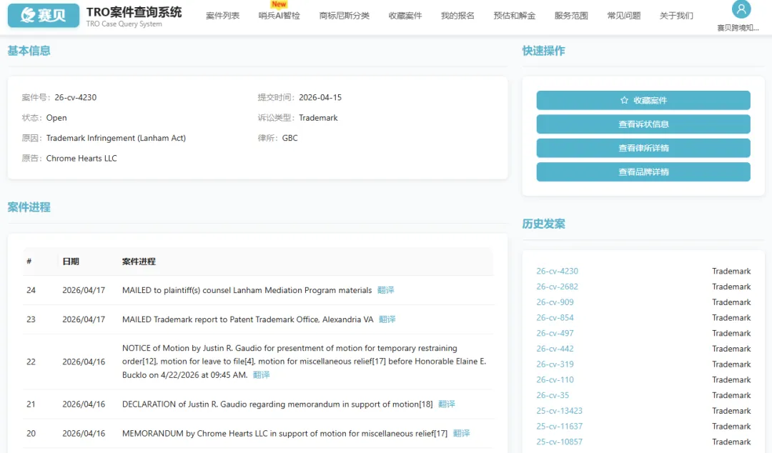 【26-cv-4230】国际奢侈品牌克罗心Chrome Hearts发起商标侵权TRO诉讼,哥特银饰+高端服饰全品类涉险,跨境卖家避坑!
