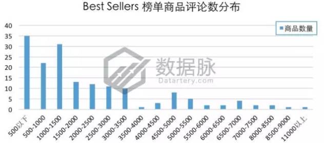 在上周登榜Clothing, Shoes & Jewelry品类Best Sellers榜单的商品中,单个商品拥有的最大评论数为13219,最小评论数为1条,平均评论数2570.1条,评论平均星级4.26星。上周Best Sellers榜单商品的平均评论数继续回升,除了依旧有21.21%的商品评论数在500条以下之外,评论数在1000条至1500条的商品占比略有增加, 达18.79%。此外,Converse 的一双经典板鞋上周成功上榜,成为唯一一款评论数破万的上榜商品。