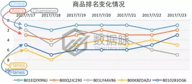 紧随其后的是另一款鞋类产品——来自品牌Asics的男式慢跑鞋,这款产品在上周的榜单表现 同样较为稳定,一周中6次跻身榜单前三,并于7月23日成功占领榜单第二的位置,平均排名2.86。
