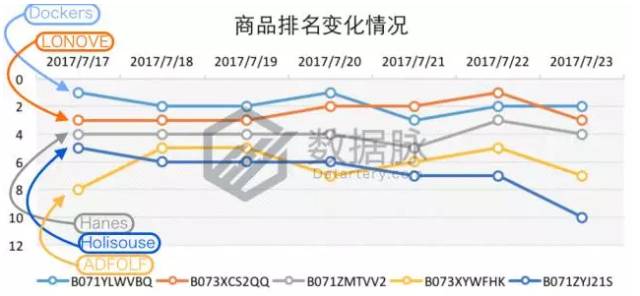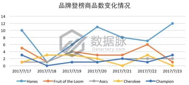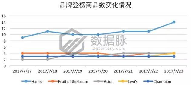 可以看到,在上周Clothing, Shoes & Jewelry品类的Best Sellers榜单中,品牌Hanes再次完美统治品牌榜——该品牌在一周中每天登榜商品数9款以上,且登榜的商品数量稳步上升,更是在7月23日创下了单日登榜商品14 款的惊人成绩,以76次的总登榜次数夺下品牌综合排名首位,另同榜竞争的其他品牌望尘莫及。此外,内衣裤品牌Fruit of the Loom、运动鞋品牌Asics、休闲服饰品牌Levi's与运动服饰品牌Champion分别位居品牌综合排名二、三、四、五位。