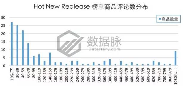在上周登榜Clothing, Shoes & Jewelry品类Hot New Releases榜单的商品中,单个商品拥有的最大评论数为3808.0,最小评论数为0.0条,平均评论数292.87条,评论平均星级4.08星。上周登榜Hot New Releases榜单的商品评论数平均水平进一步上升,共有9款商品的评论数破千,占比达5.52%。当然,作为新品榜单,该周低评论商品依旧不少,有16.56%的商品 评论数小于19条。
