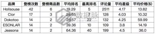 根据上周Movers & Shakers榜单上各个品牌下商品的登榜次数,我们对登榜的品牌进行了排序,其中排名靠前的五个品牌如下所示:
