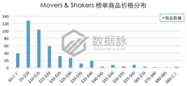 上周 Clothing, Shoes & Jewelry 品类Movers & Shakers榜单商品最高价$89.95,最低价$0.25,平均价格$18.13。骆探长发现,其中价格位于$5.00-$10.00区间内的商品数量较多,占比达27.89%,另有22.44%的商品价格位于$10.00-$15.00区间;此外,仅有1款商品价格达$85.00以上。