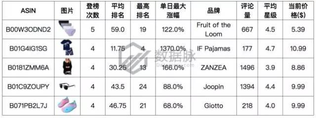 此外,品牌ZAZEA的女士T恤、品牌Joopin的太阳眼镜、品牌Giotto的水上运动鞋在上周也有4 次登榜,分别位列综合排名三、四、五位。