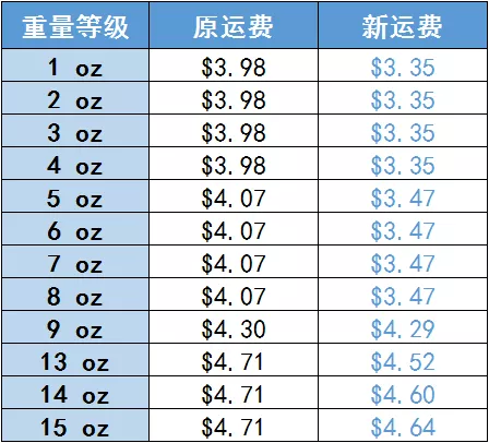 此次FBW海外仓美国路向的两大仓库运费调整中,15盎司(oz)及以下重量等级的包裹运费基本都有不同程度的下调(除10至12盎司),新的运费价格下,1至4盎司重量等级的运费仅需3.35美元,降幅超过15%;5至8盎司运费仅需3.47美元,降幅超过14%,相当划算~