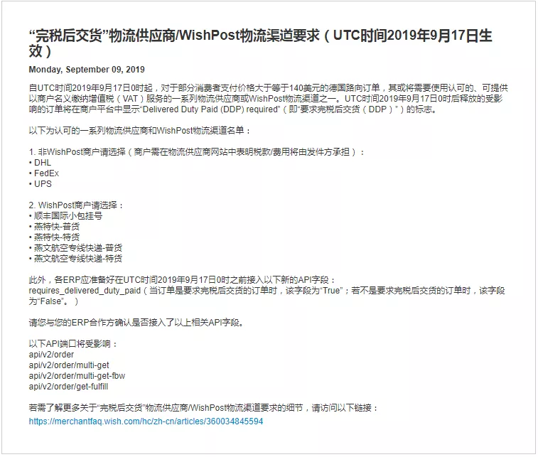 2019年9月17日0时(UTC时间)起,此类订单释放到商户后台后,会显示“Delivered Duty Paid (DDP) required”(即“要求完税后交货(DDP)”)的标志。带有此标志的订单都需要使用指定的物流服务商或WishPost物流渠道进行履行。