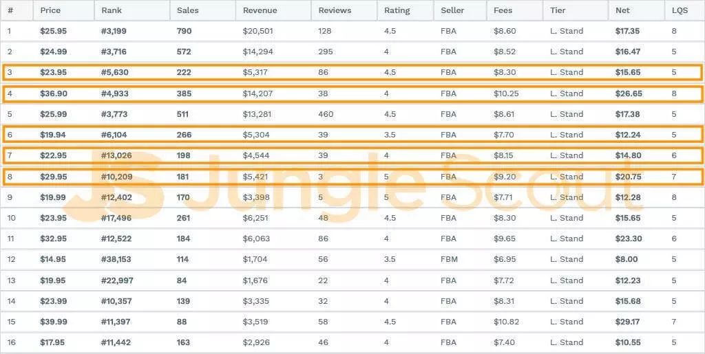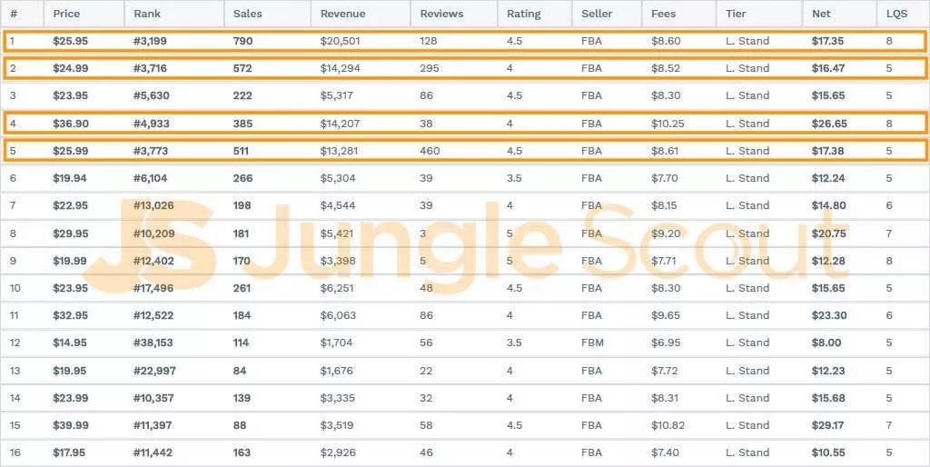 以Jungle Scout的扩展程序生成的某产品数据为例,该品类Top5的产品中就有4种商品评论数低于500条。