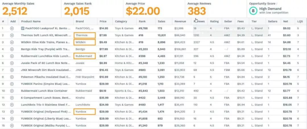 以下图的数据为例,表面上来看该品类潜力不错。但仔细分析会发现,卖家进入该市场时则面临着Thermos、Wildkin、Rubbermaid和Yumbox等知名品牌的竞争。