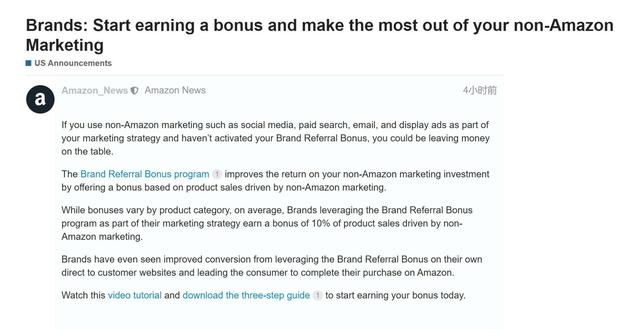 是的就在上一周,亚马逊发布了相关公告,卖家可以参加品牌推荐奖金计划赚取奖金,同时提高产品转化率。