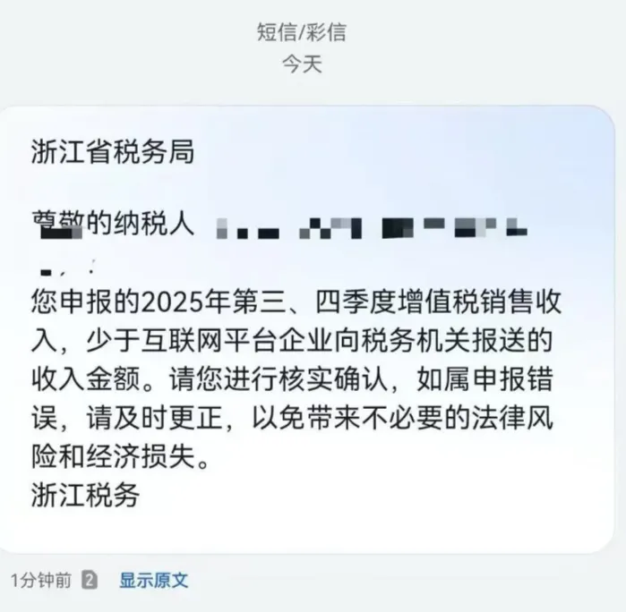 短信核心提示卖家2025年第三、四季度增值税申报收入,低于电商平台向税务机关报送的交易数据,要求卖家立即核实数据,若存在申报错误需及时更正,避免引发法律风险与经济损失。